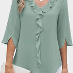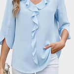 • Flæsedetaljer ved halsudskæringen – Flæserne skaber romantik og bevægelse uden at overdrive stilen.