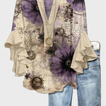 Astrid er en satinbluse, der vedvarende forener tidløs elegance med håndværk i fineste detaljer. Den naturligt hvide satin fremhæver glansen og draperingen, mens store violette blomster og retrografiske elementer skaber et kunstnerisk mønster med unik karakter. Lette volanger på ærmerne tilføjer bevægelse og raffinement uden at dominere silhuetten, og den komfortable pasform gør Astrid velegnet til både hverdagslook og særlige begivenheder. Som en begrænset udgave repræsenterer Astrid høj provenance og dedikeret håndværk, og premium materialer sikrer lang levetid og en tidløs investering for samlergarderoben. En ecru baggrund giver kontrast og dybde, og fremhæver blomsterne som et centralt designelement uden at gå på kompromis med blusens elegante fremtoning. Astrid er derfor ikke blot en bluse, men en tidsløs investering i kvalitet, der intentionelt passer ind i en kurateret garderobe.