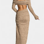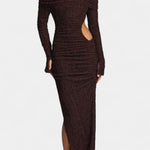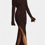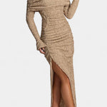 • Design og konturer: Strategiske snit fremhæver konturerne med diskret, sofistikeret elegance og passer til mange begivenheder. Rynket detalje og høj slids tilføjer struktur, bevægelse og en subtil, sensuel flair.