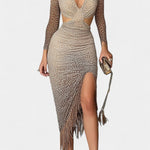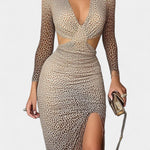 • Silhuet og snit – dybt V-hals med twistet snit og talje-snit, der skaber en dramatisk kontur.