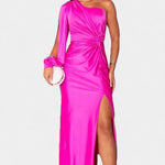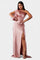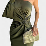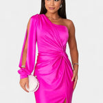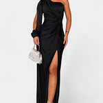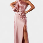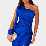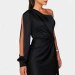 • Designdetaljer – Asymmetrisk en-skulder halsudskæring, formede draperinger og taljebind, der definerer silhuetten.