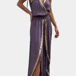 • Signaturdetaljer: krydset halsudskæring og åben ryg, der rammer décolletage og rygparti med elegance.