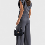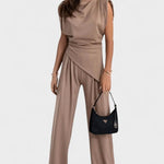 Josefine | Sofistikeret sæt er sculptural og moderne i sit udtryk. Den asymmetriske top med draperede skuldre møder brede bukser, der forlænger silhuetten og følger bevægelsen med naturlig elegance. Det lette satinagtige stof giver en diskret glans og løfter sættet fra hverdagen til lounge- eller eventlook. Designet fremhæver håndværkets omhu og materialernes kvalitet og er skabt til særlige anledninger og raffinerede hverdagslooks. Begrænsede antal tilgængelige sæt gør hvert køb eksklusivt og attraktivt for samlere af tidløst design. Josefine udtrykker kvalitetsarv, der holder i årevis og passer dagens tempo uden at gå på kompromis med komfort.