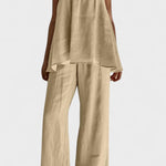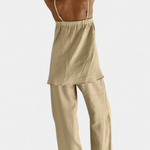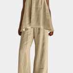 Lia | Sæt fremstår som en yndefuld manifestation af afslappet og naturlig stil. Det løse top med skulderstropper og de brede bukser skaber en behagelig, moderne silhuet, der bevæger sig let og giver en diskret, sofistikeret fremtoning. Med håndværk og omtanke i snit og finish, følger det lette, åndbare stof kroppens bevægelser uden at gå på kompromis med komforten. Lia | Sætets diskrete elegance gør det til en investering i tidløs garderobe, særligt egnet til sommerdage, ferier og rolige øjeblikke, hvor kvalitet og omtanke er i fokus.