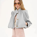 Katrine | Bomberjakke forener Luzettes dedikation til håndværk med en markant silhuet, der udstråler sofistikeret stil. Denne cropped bomberjakke fremhæves af dramatiske puffærmer, et feminint kraveparti og klassiske knapper, og den er fremstillet i nøje udvalgte tekstiler, der giver en blød, elegant finish. Med en tydelig oprindelseshistorie tilbyder Katrine autentisk kvalitet og lang levetid. Fire farver — beige, lys rosa, brun og lysegrå — giver alsidighed, mens den begrænsede tilgængelighed gør Luzette til et varigt premium-valg i enhver garderobe.