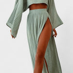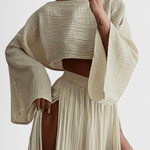 Astrid | Langærmet sæt er et sofistikeret udtryk for luksus gennem omtanke og håndværk. Det lette design binder en luftig top med en højtaljet nederdel og skaber en balance mellem elegance og friskhed, ideel til solrige dage og særlige aftener. Materialerne er lette og åndbare, og konstruktionen er nøje udformet til at holde formen og komforten gennem dagen. Som en investering i tidløs stil og kvalitetsmaterialer vidner Astrid om præcision i snit og en æstetik, der appellerer til kræsne samlere. Med begrænset antal står sætlet som en eksklusiv detalje i garderoben og vidner om en håndværkstradition, der tåler tidens prøvelser. Fuldfør looket med rem- eller håndlavede sandaler for en naturlig, afslappet elegance.