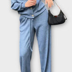 • Pasform og silhuet: Lige bukser skaber en ren, afslappet men slank silhuet; jakken i et klassisk snit tilføjer elegance.