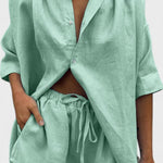 Kirstine | Langærmet sæt repræsenterer en moderne hybrid, hvor afslappet komfort møder tidløst snit. Det lette, åndbare materiale tilpasser sig kropsbevægelserne, og shortsens elastiske talje giver kravløs komfort uden at gå på kompromis med silhuetten. Sættet består af en luftig langærmet bluse og matchende shorts, designet til hverdagsbrug – fra strand til by og på rejse. Håndværket er omhyggeligt udført, og materialerne signalerer arv og kvalitet. Bevarelse i små, begrænsede partier sikrer eksklusivitet og en tidløs appel, der tiltaler den bevidste samler. Det samlede design udstråler varig værdi og alsidighed, mens finish og detaljer giver en fornemmelse af luksus, der varer ved.