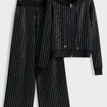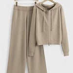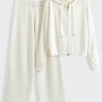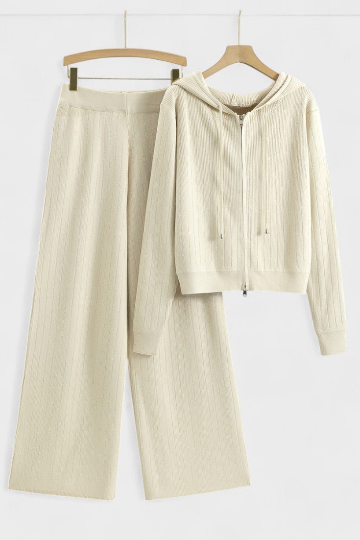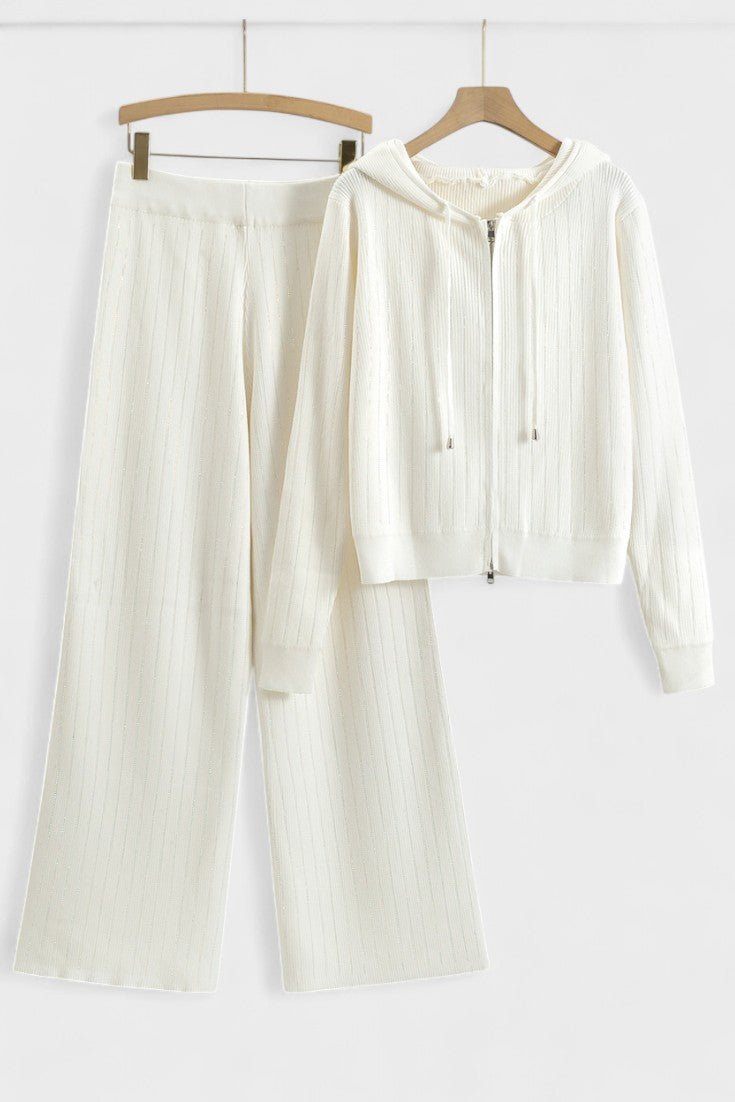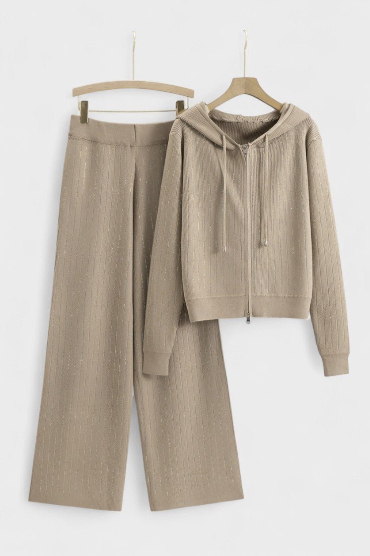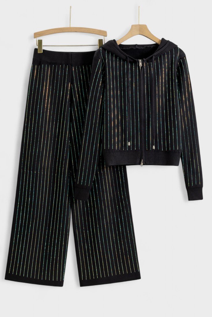 • Design og detaljer: To-delt sæt bestående af hættetrøje og brede bukser med diskrete strassdetaljer, der fanger lyset i bevægelse.